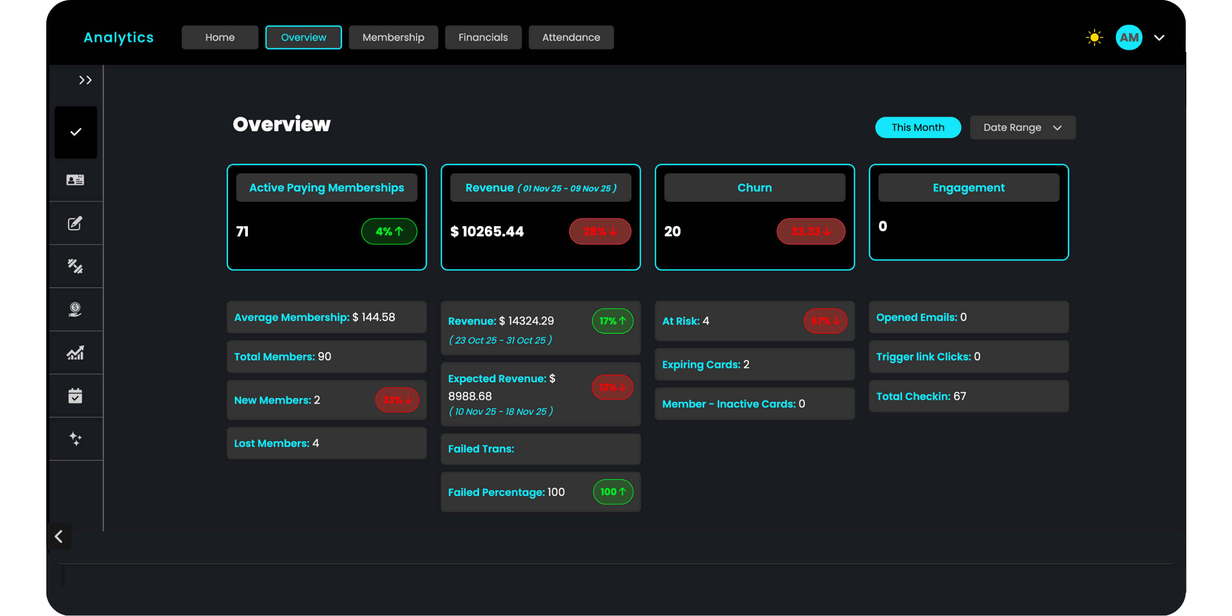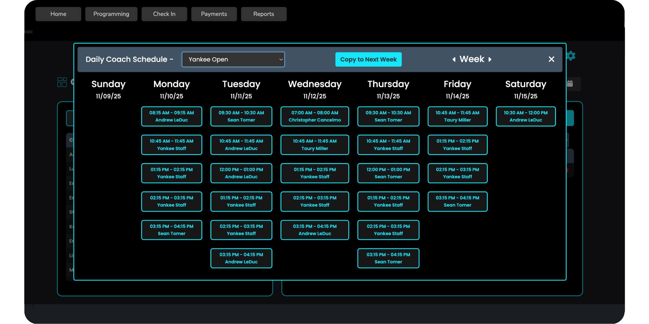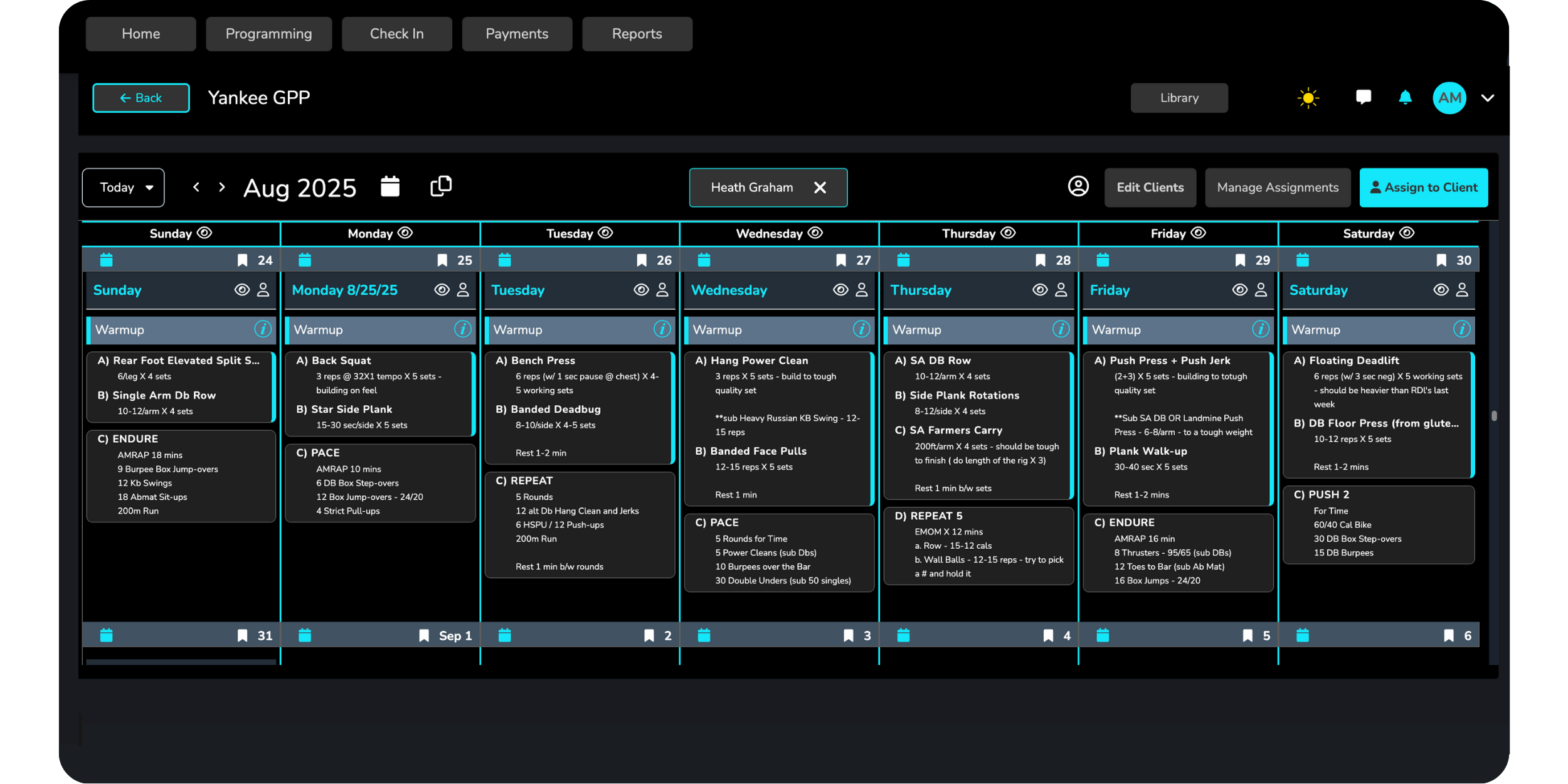 Unified calendars prevent double booking across classes, PT, and staff. Session programming is easy and make edits per-client inside a single builder. Automated session tracking, revenue and churn reporting, contracts, and payments live together under your own branded app.